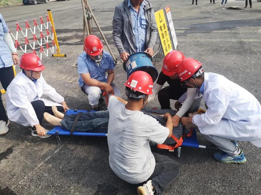 在一陣緊急呼救聲中,應(yīng)急救援演練拉開(kāi)序幕:現(xiàn)場(chǎng)模擬了施工人員在進(jìn)行井下清淤工作時(shí),由于設(shè)備內(nèi)含氧量不足,發(fā)生了窒息事故,隨即出現(xiàn)頭暈、昏迷情況,情況十分危急!施工安全員發(fā)現(xiàn)情況后,立即上報(bào)指揮長(zhǎng),請(qǐng)求相關(guān)部門協(xié)同應(yīng)急救援。安全員立即對(duì)施工井內(nèi)有毒有害氣體進(jìn)行檢測(cè),符合下井作業(yè)標(biāo)準(zhǔn);救援人員迅速佩戴氧氣罐,按指令下井搜救;醫(yī)療救護(hù)人員備齊擔(dān)架、氧氣袋、止血包扎等醫(yī)療物質(zhì),準(zhǔn)備第一時(shí)間搶救傷員。經(jīng)現(xiàn)場(chǎng)緊急封鎖、傷員移交醫(yī)院、施工人員清點(diǎn)、設(shè)備物資檢查等步驟,事件得到了有效處置,演練總指揮宣布此次“有限空間作業(yè)突發(fā)事件”應(yīng)急救援演練任務(wù)圓滿完成。