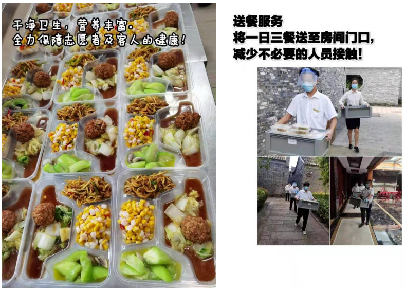 嚴(yán)控食品安全管理不越紅線。嚴(yán)格把控食品安全關(guān),建議供貨商進(jìn)行無(wú)接觸配送,每日及時(shí)清理過期變質(zhì)原料和食品;客人餐食合理搭配,營(yíng)養(yǎng)均衡,每日將三餐送至客房區(qū)域,由客人自取,用餐完畢由服務(wù)人員取走餐具進(jìn)行清洗、消毒,垃圾統(tǒng)一回收處理。