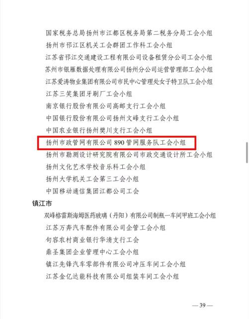 近日,江蘇省總工會表彰了一批省模范職工之家、模范職工小家、優(yōu)秀工會工作者。揚州市政管網有限公司“890管網服務隊”榮獲“江蘇省模范職工小家”稱號。