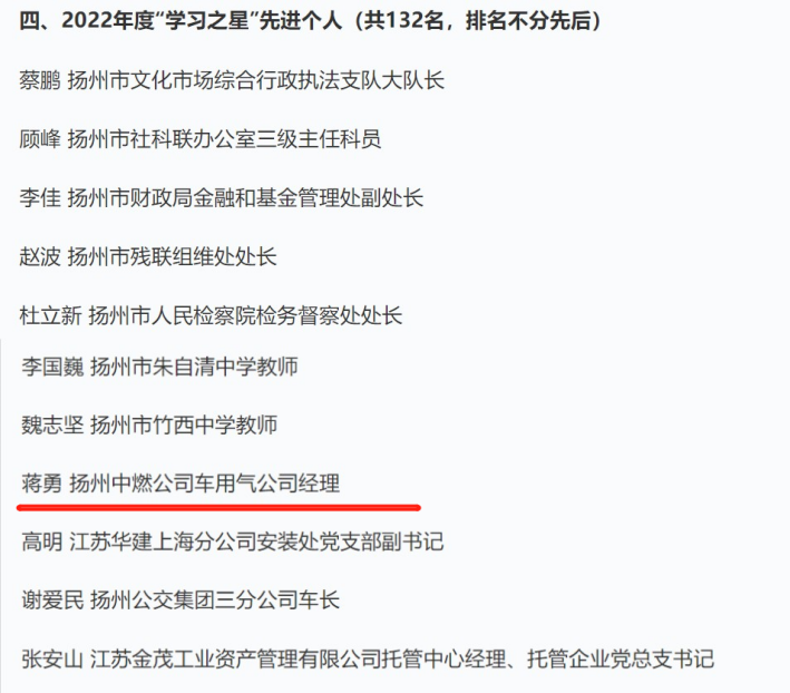近日,“學(xué)習(xí)強(qiáng)國(guó)”揚(yáng)州學(xué)習(xí)平臺(tái)發(fā)布了《關(guān)于2022年度揚(yáng)州市“學(xué)習(xí)強(qiáng)國(guó)”優(yōu)秀通訊站、優(yōu)秀通訊員、“學(xué)習(xí)之星”先進(jìn)組織、“學(xué)習(xí)之星”先進(jìn)個(gè)人的通報(bào)》,集團(tuán)下屬供熱公司黨總支被表彰為2022年度揚(yáng)州市“學(xué)習(xí)強(qiáng)國(guó)”“學(xué)習(xí)之星”先進(jìn)組織、揚(yáng)州中燃公司蔣勇被表彰為“學(xué)習(xí)之星”先進(jìn)個(gè)人榮譽(yù)稱號(hào)。