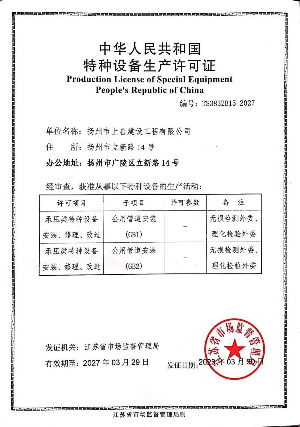 近日,上善公司成功取得特種設(shè)備生產(chǎn)許可證,并成功入圍揚州中燃城市燃氣發(fā)展有限公司2023-2025年分布式集中供能工程施工庫。