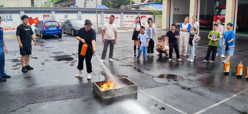 最后,在消防隊(duì)員的指導(dǎo)下,家長們進(jìn)行了滅火演練,一旁觀摩的孩子們?yōu)榧议L們的表現(xiàn)鼓勁歡呼。