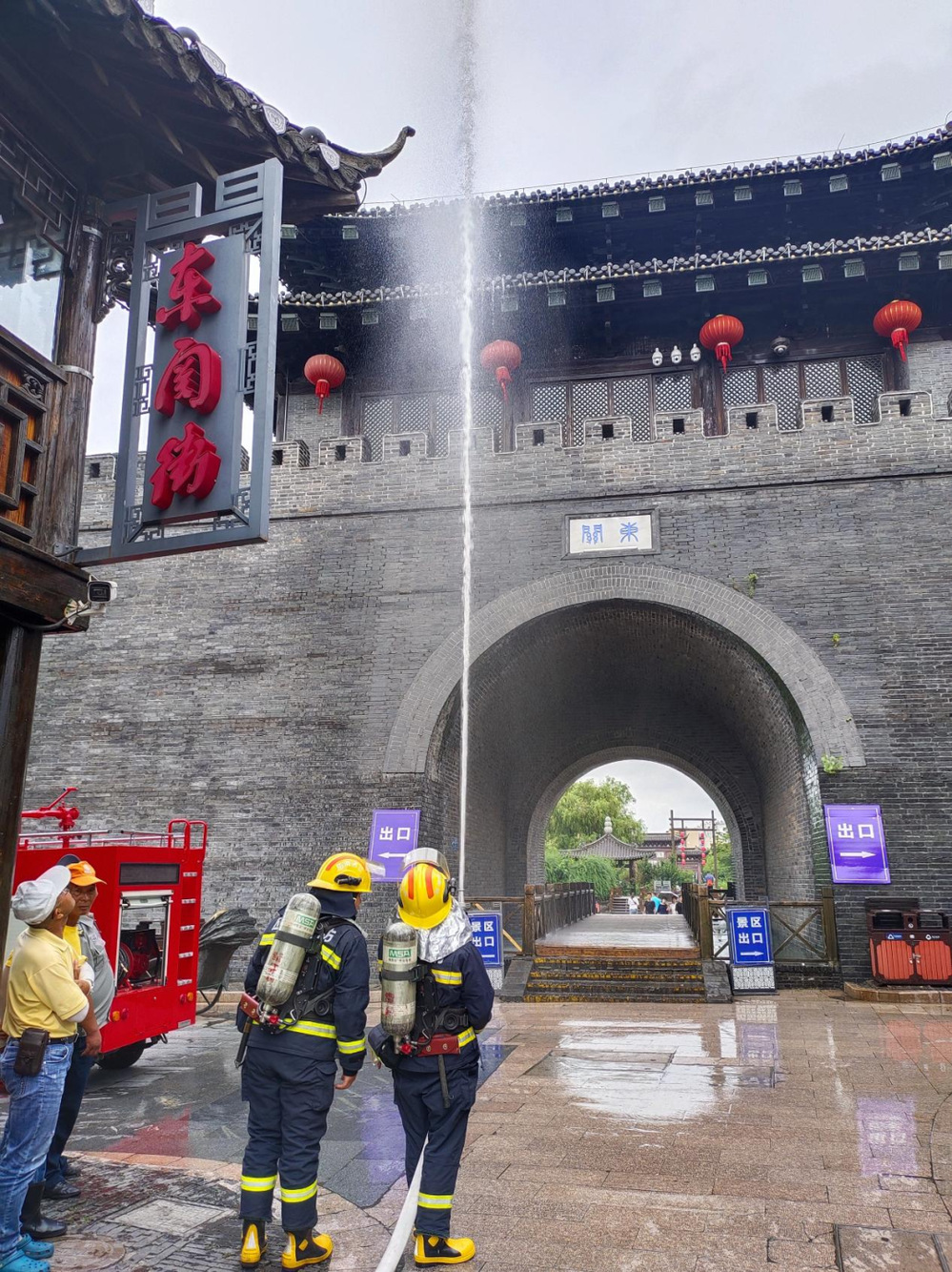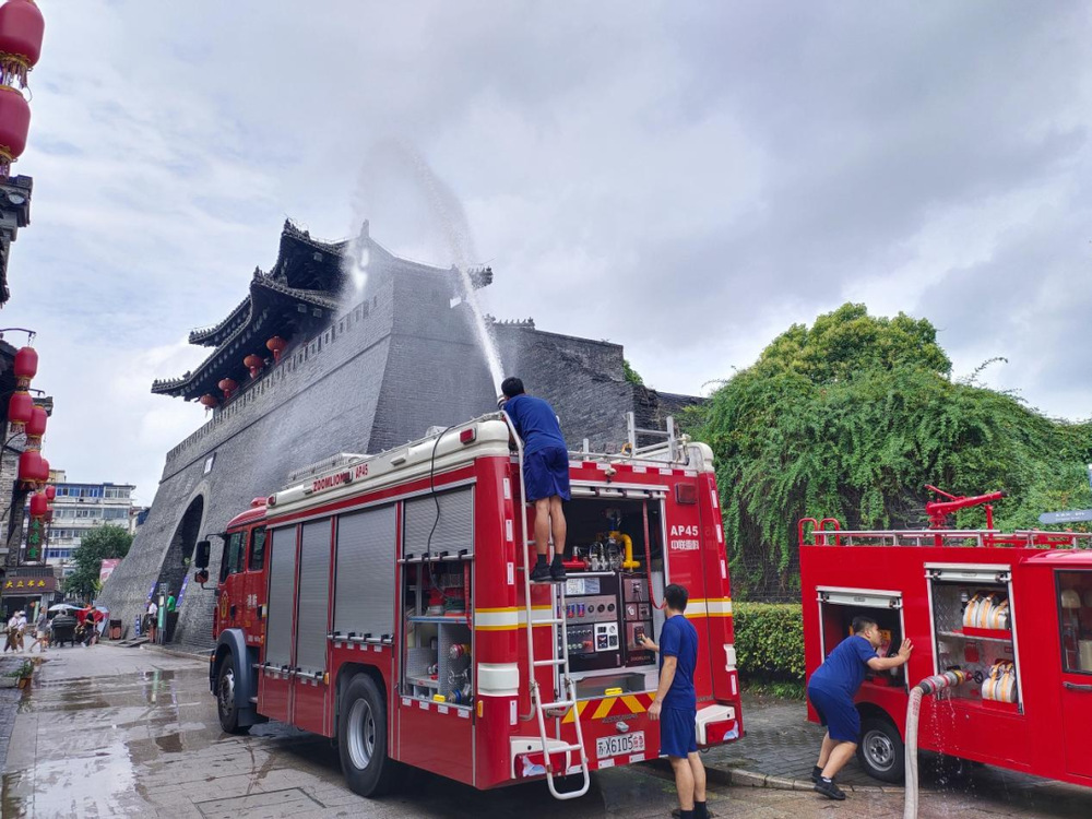 此次演習(xí)從實戰(zhàn)的角度出發(fā),測算水帶干線的鋪設(shè)距離、水槍陣地設(shè)置、力量部署、車輛的位置??康刃畔ⅰQ菥毲?,消防員與安保人員再次逐一對消防通道、室外消火栓布局、水源分布、電源位置等情況查看。隨后,消防員模擬街區(qū)最高點城門樓重檐頂部起火,根據(jù)前期制定的滅火救援方案從多角度、多位置對“著火點”進(jìn)行滅火救援。