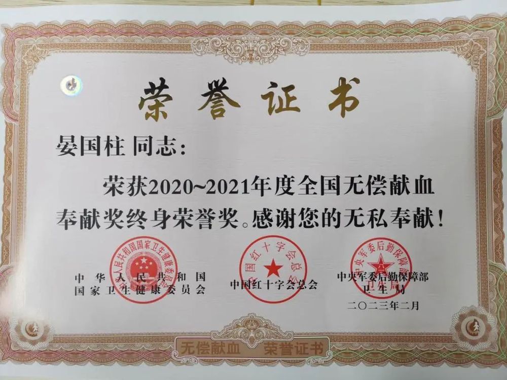 點滴熱血,“輸”寫大愛。日前,供熱公司“暖揚”服務隊隊長晏國柱同志被國家衛(wèi)生健康委、中國紅十字總會、中央軍委后勤保障部衛(wèi)生局聯(lián)合授予“無償獻血奉獻獎終身榮譽獎”。