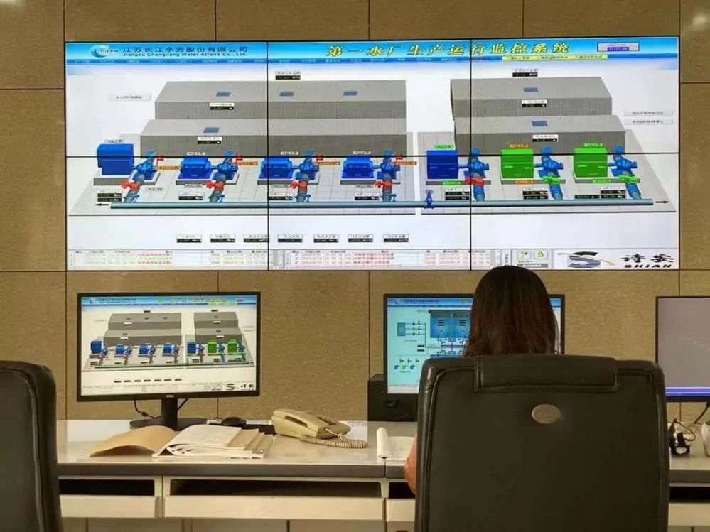 第一水廠中控室值班員在監(jiān)測機(jī)組數(shù)據(jù)