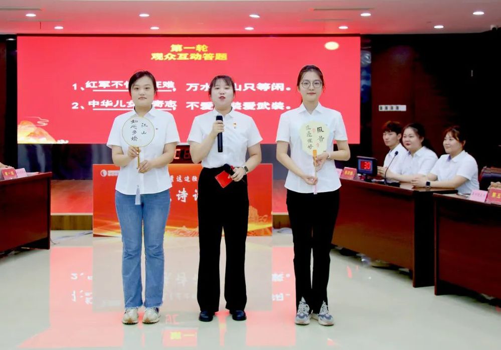 風(fēng)險(xiǎn)題“飛花令”環(huán)節(jié)將競賽推向高潮?!耙粯蝻w架南北,天塹變通途”“赤橙黃綠青藍(lán)紫,誰持彩練當(dāng)空舞?”“裝點(diǎn)此關(guān)山,今朝更好看”……各支代表隊(duì)你來我往,輪番背誦含有“數(shù)字”、“顏色”、“山”的毛澤東詩詞,選手們進(jìn)行了一場文化素養(yǎng)與詩詞積累的較量,精彩的接龍不時(shí)贏得觀眾的陣陣喝彩。經(jīng)過近兩個(gè)小時(shí)的激烈角逐,最終第一黨支部代表隊(duì)榮獲一等獎(jiǎng)、第三黨支部代表隊(duì)獲得二等獎(jiǎng)、第二黨支部代表隊(duì)獲得三等獎(jiǎng)。
