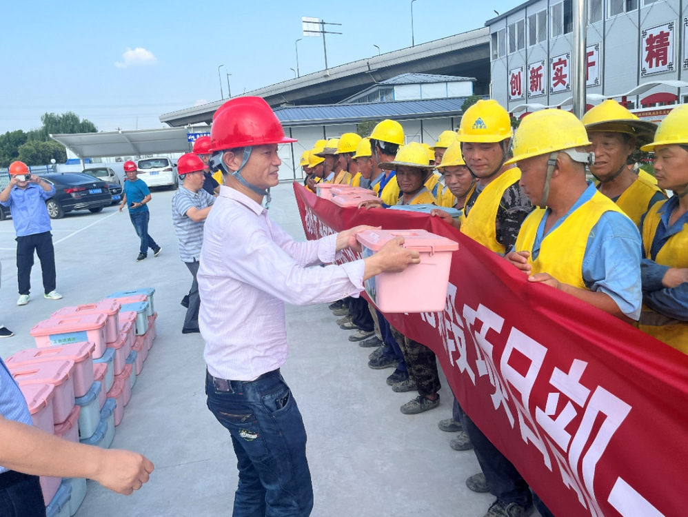 活動(dòng)現(xiàn)場(chǎng),市總工會(huì)范華一行為高溫下堅(jiān)守崗位的工人師傅道辛苦、說感謝、送關(guān)懷,并遞上高溫清涼慰問品。范華囑托運(yùn)河路北延項(xiàng)目部一定要抓好施工一線人員的防暑降溫和健康安全工作,特別是當(dāng)前面臨著戰(zhàn)高溫、防汛防臺(tái)等形勢(shì)。同時(shí),他激勵(lì)項(xiàng)目部全體人員要繼續(xù)保持“精益卓越、拼搏奉獻(xiàn)”的大愛精神,為揚(yáng)州的建設(shè)和人民美好生活貢獻(xiàn)力量。