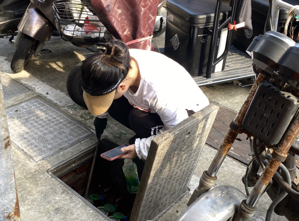 臨近中午,頭頂烈日,水表箱的重量對于身材嬌小的蔣姝雯來說,徒手拎起來很是吃力,于是長鐵鉤成了她抄表時(shí)的“好搭檔”,勾起井蓋、對照表盤,完成讀數(shù)回錄后,她又重新用鐵鉤將井蓋蓋好。整個(gè)過程,就見她彎腰、蹲下、起身,再彎腰、再起身,反反復(fù)復(fù),汗水很快濕透她的衣服。一只水表抄完后,她又沿路前行,查看下一個(gè)水井表。