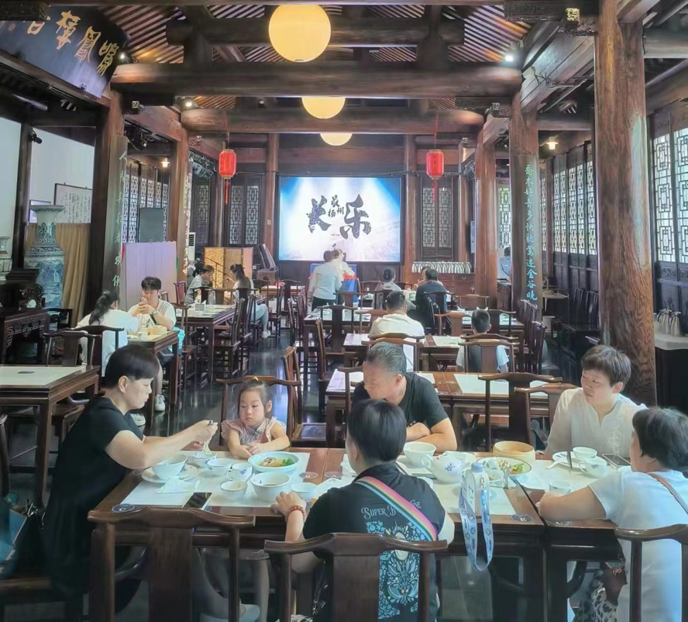 青磚小瓦馬頭墻,回廊掛落花格窗,長樂客棧以“精致茶點+園林景致”,希望廣大游客和市民慢下來、停下來、留下來,共享“四時之鮮、園林之秀、曲藝之雅和揚工之美”的揚州慢生活。