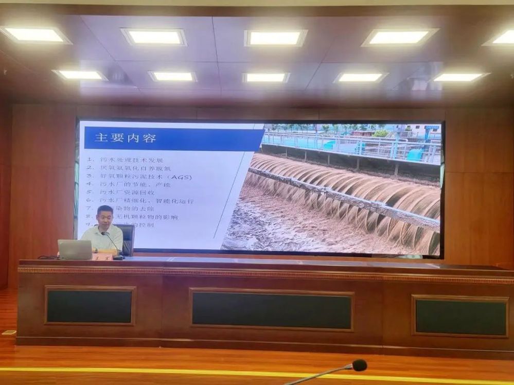 培訓(xùn)邀請了揚州大學(xué)環(huán)境科學(xué)與工程學(xué)院副院長、教授吳軍進(jìn)行授課。吳教授從厭氧氨氧化自養(yǎng)脫氮、好氧顆粒污泥技術(shù) (AGS)、污水廠的節(jié)能, 產(chǎn)能、污水廠資源回收、污水廠精細(xì)化,智能化運行、新污染物的去除、進(jìn)水無機顆粒物的影響和溢流污染的控制等多個方面對污水處理技術(shù)進(jìn)行了生動講解,并為技術(shù)人員答疑解惑,現(xiàn)場研學(xué)氛圍濃厚。