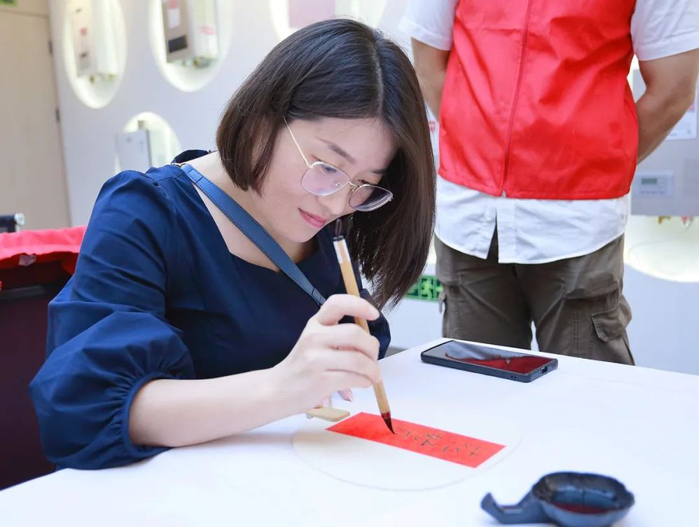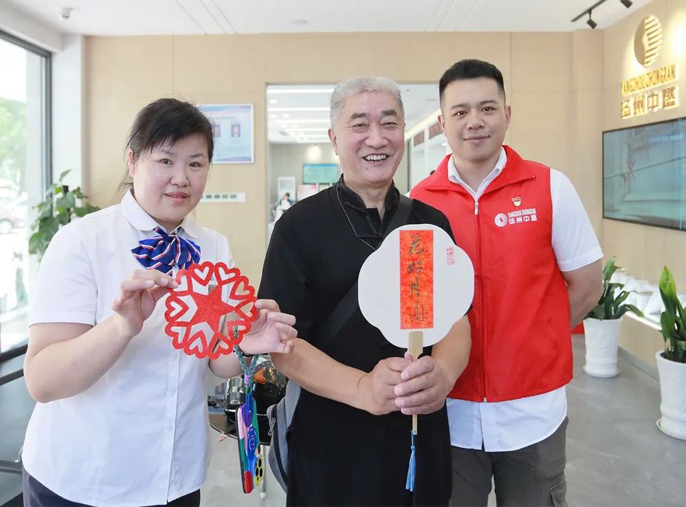 團扇寓意著團團圓圓、家庭美滿、闔家歡樂。貼上萬年紅方宣,飽蘸一得閣墨汁,中秋安康,平安喜樂,氣聚人和、但愿人長久、千里共嬋娟……一幅幅墨寶被志愿者賦予了濃情和溫度,一張張笑臉隨筆墨齊飛揚。前來辦理業(yè)務(wù)的戚女士也是書法愛好者,與志愿者們交流切磋,現(xiàn)場即興書寫了一把小楷“花好月圓”團扇,開心地說:感謝揚州中燃提供的互動平臺,過了一把癮;印刷的書畫團扇花錢隨處都能買到,但我還是喜歡手寫的,有溫度、接地氣,每一幅都是獨一無二的,福氣滿滿、韻味濃濃。