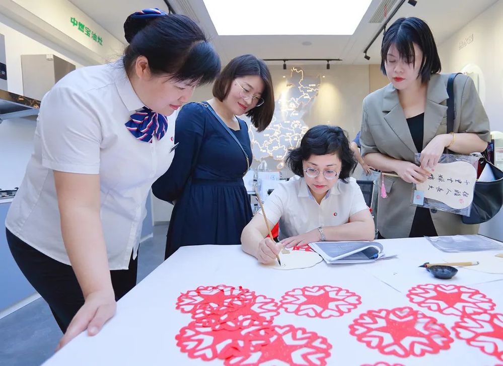 歡歡喜喜迎國慶。折疊紅紙、設(shè)計圖案、剪裁紙張,一幅幅“中國心中國星”剪紙作品呈現(xiàn)在大家眼前。活動現(xiàn)場氣氛熱烈,不少提前得到消息的市民更是遠(yuǎn)道趕來,現(xiàn)場學(xué)起了剪紙,來了一個DIY。通過這樣的活動激發(fā)市民心里共鳴,營造愛國主義氛圍,共同祝愿偉大祖國繁榮昌盛。