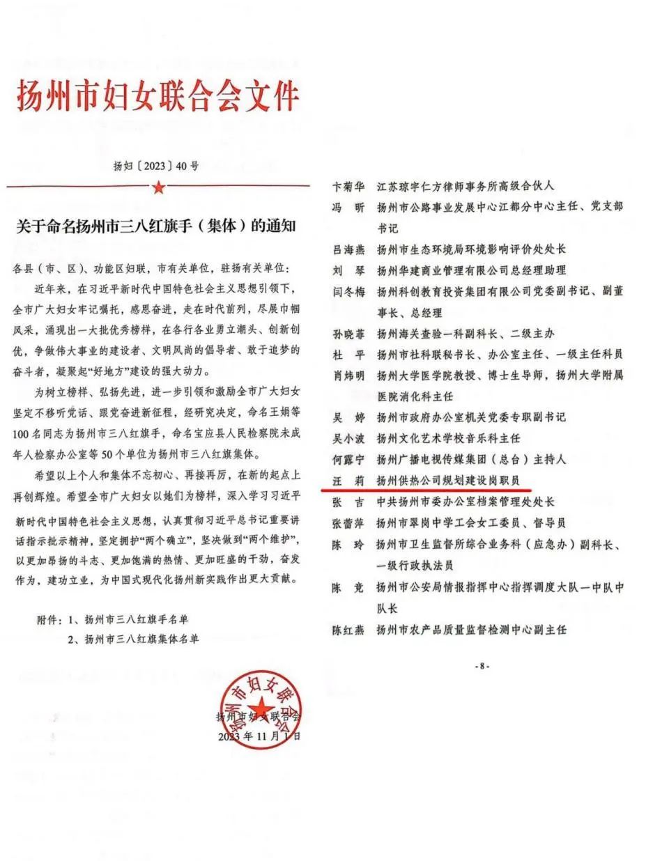 11月8日上午,揚(yáng)州市婦女第八次代表大會(huì)開幕,開幕會(huì)上表彰了揚(yáng)州市三八紅旗手(集體)。供熱公司總師辦職員汪莉獲得“揚(yáng)州市三八紅旗手”的榮譽(yù)稱號(hào)。