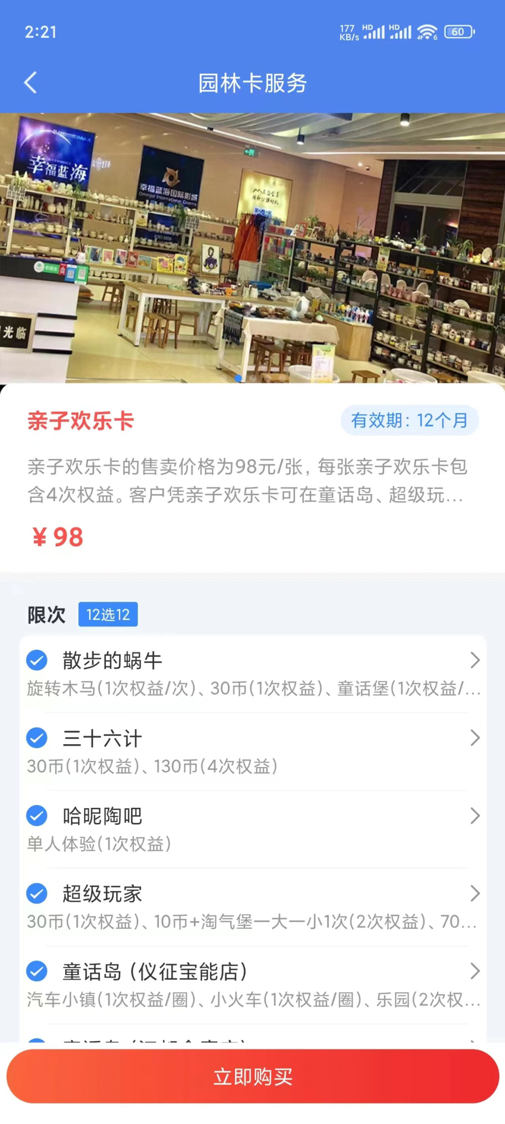 各商戶提供游玩項(xiàng)目,需扣除相應(yīng)的權(quán)益次數(shù)。權(quán)益次數(shù)至購(gòu)買日起一年內(nèi)有效。