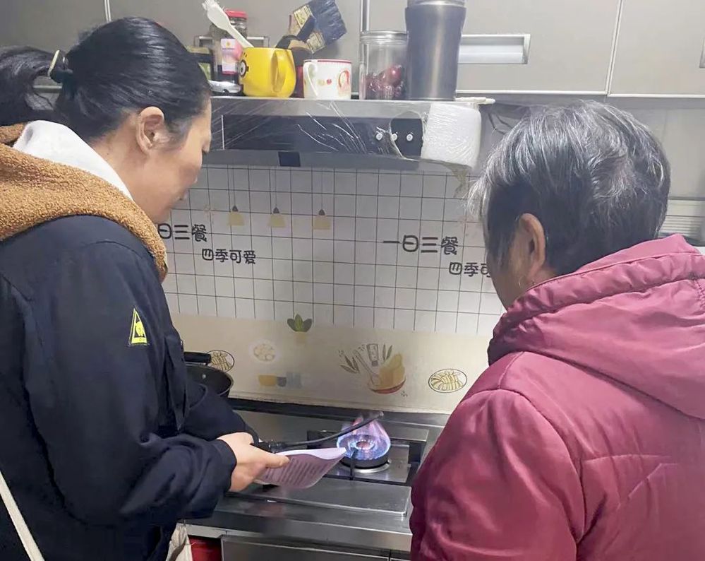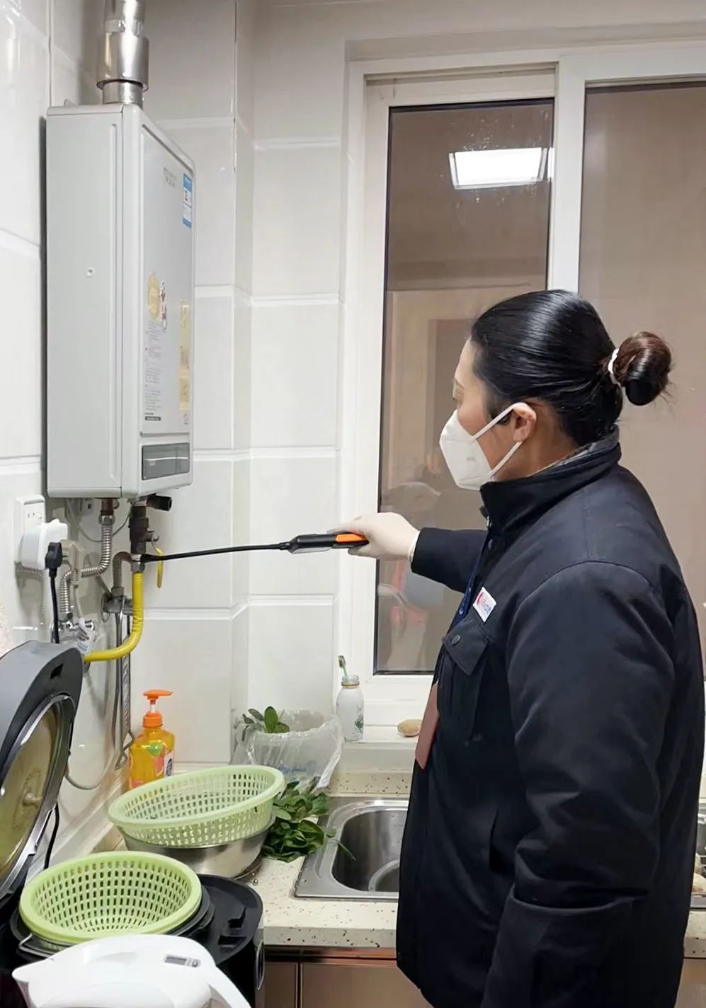 有著8年從業(yè)經(jīng)驗(yàn)的戴潔,對(duì)待燃?xì)獍矙z工作特別嚴(yán)謹(jǐn)。按照安檢流程,她從用戶廚房的第一道閥門開始仔細(xì)檢測(cè)管道是否有異常,接口處是否有漏點(diǎn),燃?xì)庠罹摺⑷細(xì)鉄崴魇欠癯谑褂??!皺z測(cè)儀不響就沒問題,如果連續(xù)發(fā)出‘嘀嘀嘀’的報(bào)警聲就說明有泄漏,發(fā)現(xiàn)漏氣要立即報(bào)修,確保安全”,戴潔邊說邊示范,同時(shí)向用戶宣傳普及燃?xì)獍踩R(shí)和燃?xì)庑孤?yīng)急處置措施,叮囑用戶一旦發(fā)現(xiàn)燃?xì)庑孤瑧?yīng)打開門窗,切斷室內(nèi)燃?xì)饪傞y,室內(nèi)嚴(yán)禁動(dòng)火和動(dòng)電源,到室外撥打燃?xì)鈭?bào)修電話,幫助用戶規(guī)范用氣、安全用氣。