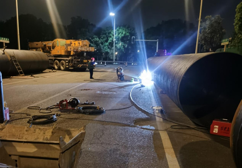 在管道焊接環(huán)節(jié),本項(xiàng)目DN1800污水管道采用雙管敷設(shè),DN2000鋼套管內(nèi)嵌DN1800污水管,創(chuàng)新采用“地面預(yù)制+整體吊裝”工藝,將15米雙管在地面焊接成型后,由兩臺(tái)50噸吊車協(xié)同作業(yè)精準(zhǔn)下放。為確保零滲漏,項(xiàng)目團(tuán)隊(duì)在雙管間隙注入高壓水泥漿,形成雙重密封,噴淋系統(tǒng)、霧炮車全天候抑塵,基坑積水即時(shí)抽排,有力實(shí)現(xiàn)了揚(yáng)塵不擴(kuò)散、泥水不外流。