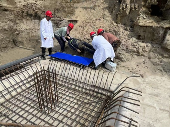 此次應(yīng)急演練模擬施工現(xiàn)場塔吊基坑邊坡因連續(xù)降雨出現(xiàn)局部坍塌,1名工人被困,周邊土體存在繼續(xù)滑移的風(fēng)險(xiǎn)等情形。演練活動涉及應(yīng)急隊(duì)伍集結(jié)、受傷人員醫(yī)療救護(hù)、工程應(yīng)急處置搶險(xiǎn)等多個(gè)環(huán)節(jié)。現(xiàn)場總指揮收到救援消息后,立即啟動應(yīng)急救援預(yù)案。各小組響應(yīng)迅速、職責(zé)明確,警戒組及時(shí)封鎖現(xiàn)場;救援組進(jìn)行隱患排查,制定支護(hù)方案并對基坑周邊進(jìn)行加固,防止邊坡發(fā)生二次坍塌;醫(yī)療救護(hù)組開展救援,對傷者進(jìn)行包扎檢查,并將傷者送至路邊等待救護(hù)車到場送至醫(yī)院。在各小組的密切配合下,在全體演練人員的共同努力下,演練取得圓滿成功。