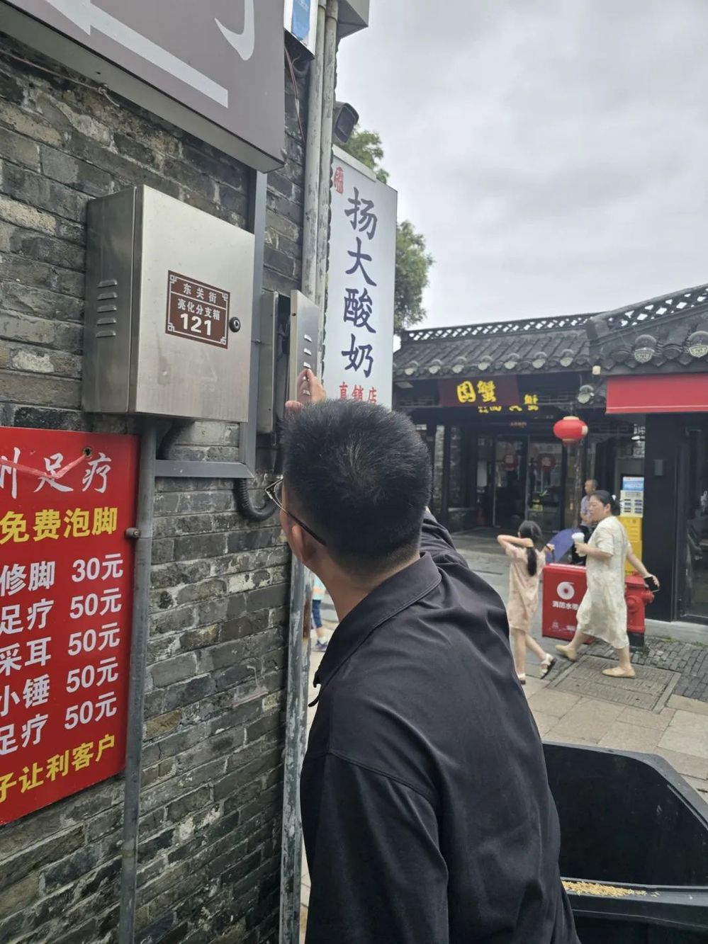 上午10點(diǎn),地表溫度突破40℃。魯毅的工作服已濕透,他正蹲在一家文創(chuàng)店后巷,檢查私拉電線給電動(dòng)車充電的問(wèn)題?!靶±?,這線路像蜘蛛網(wǎng)一樣,臺(tái)風(fēng)一來(lái)準(zhǔn)出問(wèn)題?!彼托慕忉專f(xié)助店主聯(lián)系專業(yè)電工重新布線。此時(shí),對(duì)講機(jī)響起:“街區(qū)東門入口客流較大,需要密切關(guān)注!”魯毅立即調(diào)轉(zhuǎn)方向,通過(guò)智慧平臺(tái)調(diào)度保安分流人群,同時(shí)用擴(kuò)音器提醒游客:“前面石板路滑,請(qǐng)靠右行走!”
