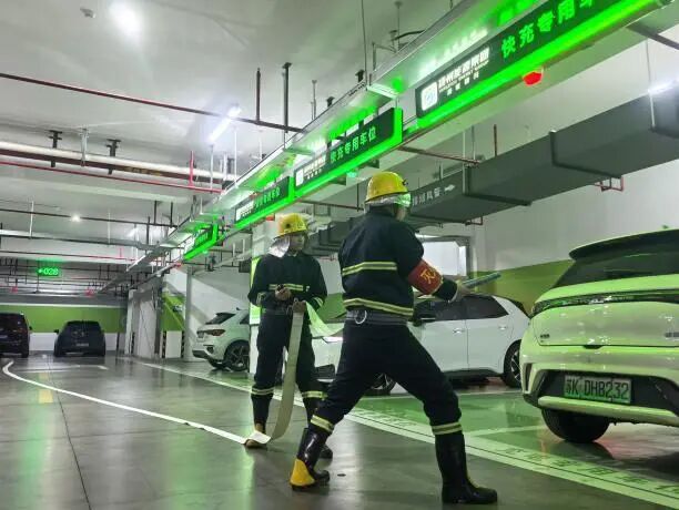本次演習模擬地下車庫充電樁線路因短路引發(fā)起火、濃煙蔓延的險情。煙感報警觸發(fā)后,商場立即啟動充電樁火災(zāi)應(yīng)急預(yù)案,各專項小組嚴格按照預(yù)案要求高效聯(lián)動:警戒組快速劃定警戒區(qū)域;通訊組精準通知車庫內(nèi)車主緊急移車;疏散組引導(dǎo)商戶及工作人員沿指示標識撤離;滅火組穿戴專業(yè)防護裝備,嚴格遵循“斷電優(yōu)先、精準撲救”的處置原則,成功撲滅模擬火情。