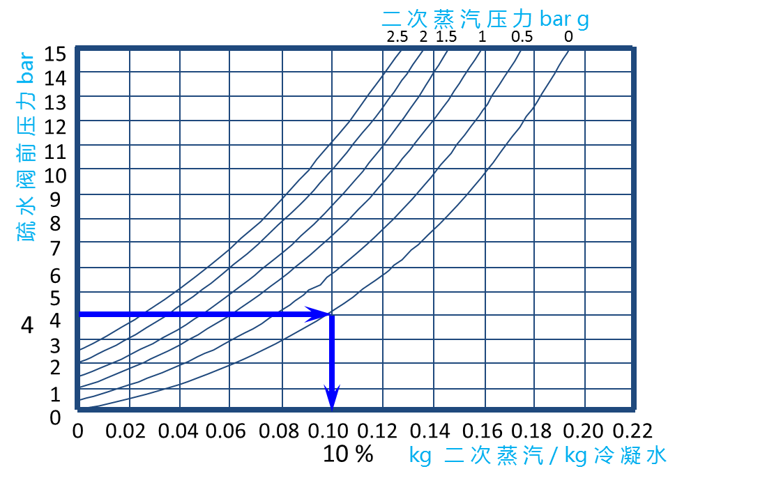 冷凝水壓力越大,二次蒸汽壓力越低,可回收利用的熱能就越多,如下圖可知,當(dāng)冷凝水壓力(及疏水閥前壓力)達(dá)到4bar,二次蒸汽壓力為大氣壓時(shí),閃蒸率為10%: