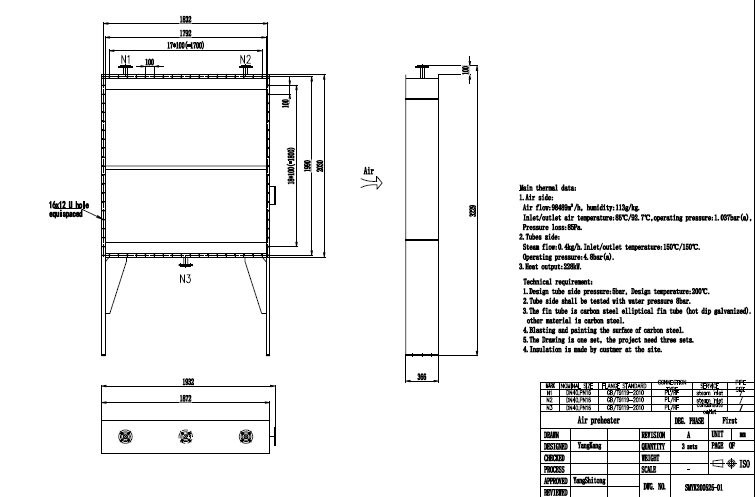 對(duì)每條線的現(xiàn)有預(yù)加熱器進(jìn)行改造,根據(jù)現(xiàn)有尺寸、接口改造為蒸汽、空氣換熱的管殼換熱器,預(yù)加熱器改造圖如圖4:
