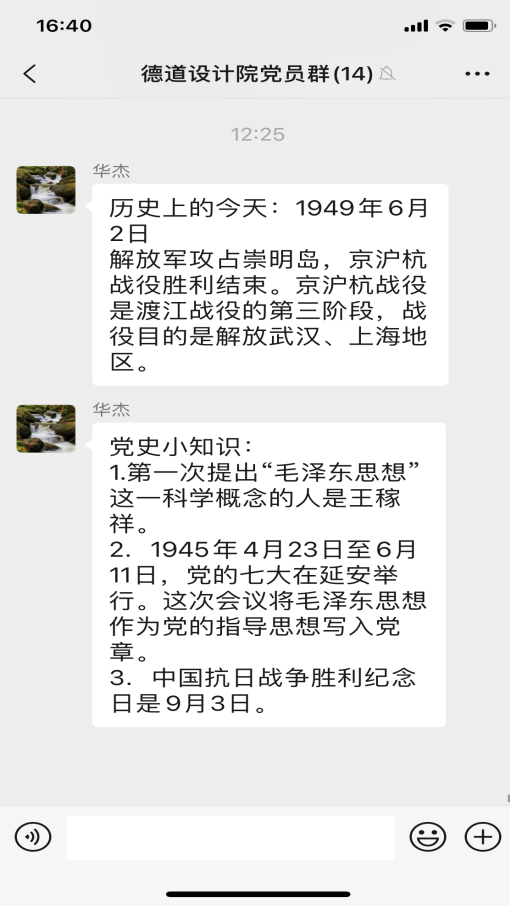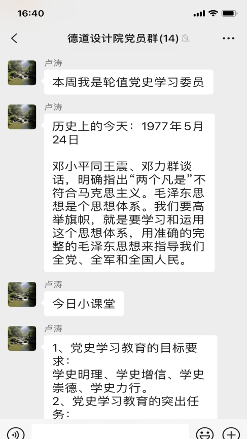 近日,為提升學史學習教育的實效性,設計院支部創(chuàng)新思路,結(jié)合工作的特殊性,以“黨員學習群”為載體,開展“輪值學習委員領學”活動,排出學習委員輪值表,支部委員帶頭,黨員跟上,每周由一名“學習委員”,帶領大家開展黨史線上學習。輪值學習委員在值班日當天利用中午時間,通過微信群,“敲黑板、劃重點”,發(fā)布“歷史上的今天”和“今日小課堂”兩個版塊的學習內(nèi)容。“歷史上的今天”展示了中國共產(chǎn)黨和新中國成立以來重大事件?!敖袢招≌n堂”每日推送三條黨史學習教育內(nèi)容,讓支部每個黨員在靈活時間內(nèi)完成學習,汲取知識。