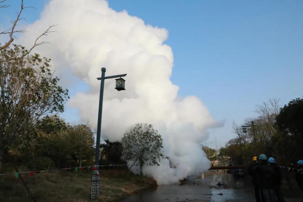 為確保吹掃工作安全順利進(jìn)行,供熱公司提前制定供熱管道吹掃技術(shù)方案并進(jìn)行模擬操作。15:00,隨著閥門緩緩打開,一股蒸汽噴薄而出,市區(qū)北部主干線(一期)工程管道吹掃正式開始。市區(qū)北部主干線(一期)工程吹掃作業(yè)的圓滿完成,標(biāo)志著該工程具備投運(yùn)條件,為實(shí)現(xiàn)揚(yáng)州市區(qū)管網(wǎng)“互聯(lián)互通”奠定了堅(jiān)實(shí)的基礎(chǔ)。