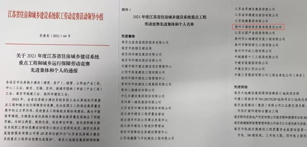 近日,江蘇省住房和城鄉(xiāng)建設(shè)系統(tǒng)職工勞動(dòng)競賽活動(dòng)領(lǐng)導(dǎo)小組發(fā)布《關(guān)于2021年度江蘇省住房城鄉(xiāng)建設(shè)系統(tǒng)重點(diǎn)工程和城鄉(xiāng)運(yùn)行保障勞動(dòng)競賽先進(jìn)集體和個(gè)人的通報(bào)》。其中,集團(tuán)下屬企業(yè)萬福公司榮獲“2021年度省住建系統(tǒng)重點(diǎn)工程勞動(dòng)競賽先進(jìn)集體”稱號,長江水務(wù)和揚(yáng)州中燃榮獲“2021年度省住建系統(tǒng)城鄉(xiāng)運(yùn)行保障勞動(dòng)競賽先進(jìn)集體”稱號。