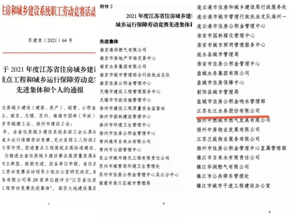 近日,長江水務(wù)公司被授予“2021年度省住建系統(tǒng)城鄉(xiāng)運(yùn)行保障勞動(dòng)競賽先進(jìn)集體”光榮稱號,受到省住建系統(tǒng)競賽領(lǐng)導(dǎo)小組蘇建競【2021】64號文件通報(bào)表彰。