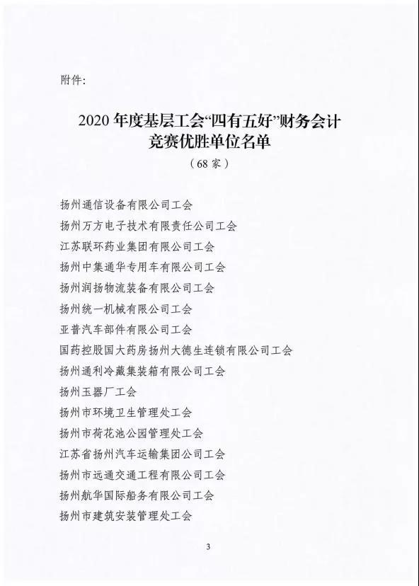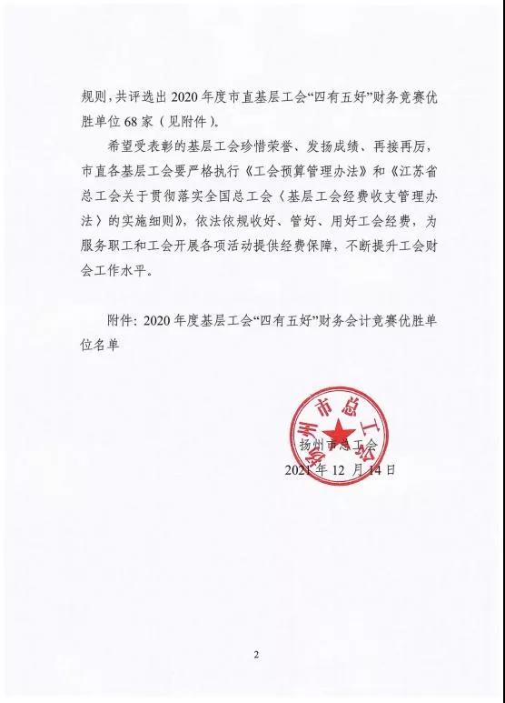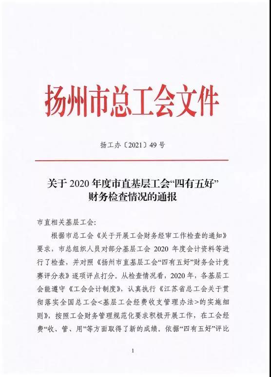 12月14日,市總工會發(fā)布了“關(guān)于2020年度市直基層工會‘四有五好’財務(wù)檢查情況的通報”,資產(chǎn)公司聯(lián)合基層工會榮列優(yōu)勝單位榜單。