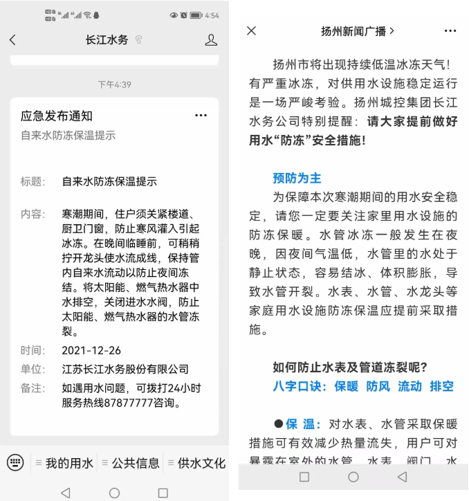 通過電視滾動字幕、廣播電臺、揚(yáng)州發(fā)布、揚(yáng)帆、“我的揚(yáng)州”APP等傳媒渠道,加密自來水防凍保溫宣傳,編輯手機(jī)短信作“溫馨提示”,點(diǎn)到點(diǎn)發(fā)給自來水用戶,擴(kuò)大自來水防凍宣傳面,進(jìn)一步強(qiáng)化居民自身防范意識,引導(dǎo)用戶做好關(guān)閉廚衛(wèi)門窗、包裹戶外水管、覆蓋水表、關(guān)閉空關(guān)房水閥等防范工作。