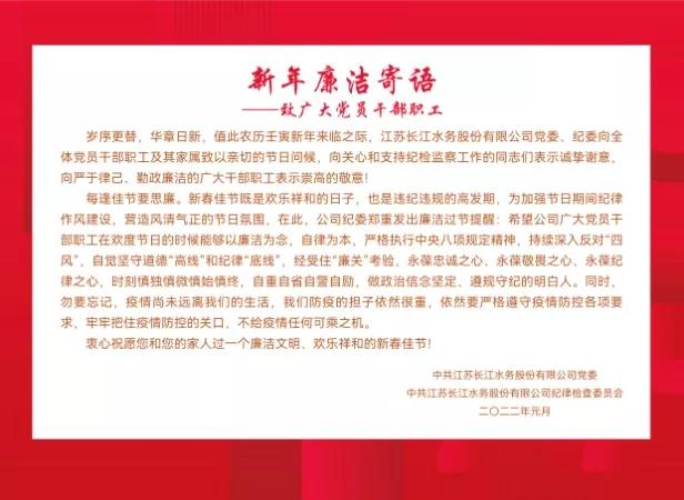 為認(rèn)真貫徹落實(shí)城控集團(tuán)紀(jì)委《關(guān)于進(jìn)一步加強(qiáng)春節(jié)期間紀(jì)律作風(fēng)建設(shè)的通知》要求,持續(xù)推進(jìn)中央八項(xiàng)規(guī)定精神及其實(shí)施細(xì)則落地生根,嚴(yán)防“四風(fēng)”問題反彈回潮,提醒黨員干部職工廉潔過節(jié)。春節(jié)前夕,長江水務(wù)公司紀(jì)委精心制作了100余份“新春廉潔卡”,向公司領(lǐng)導(dǎo)班子、各部門負(fù)責(zé)人及部分黨員干部職工送去了廉潔提醒和節(jié)日祝福,提醒大家把好節(jié)日廉潔“第一關(guān)口”,營造廉潔文明、歡樂祥和的節(jié)日氛圍。