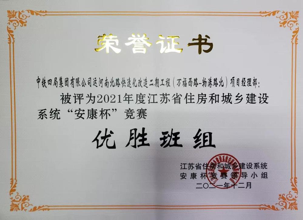 近日,揚(yáng)州快速路項(xiàng)目運(yùn)河南北路快速化改造二期工程(萬福西路-物港路北)項(xiàng)目經(jīng)理部獲得2021年江蘇省住房和城鄉(xiāng)建設(shè)系統(tǒng)“安康杯”競(jìng)賽優(yōu)勝班組榮譽(yù)稱號(hào)。