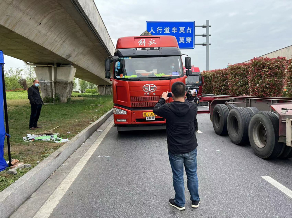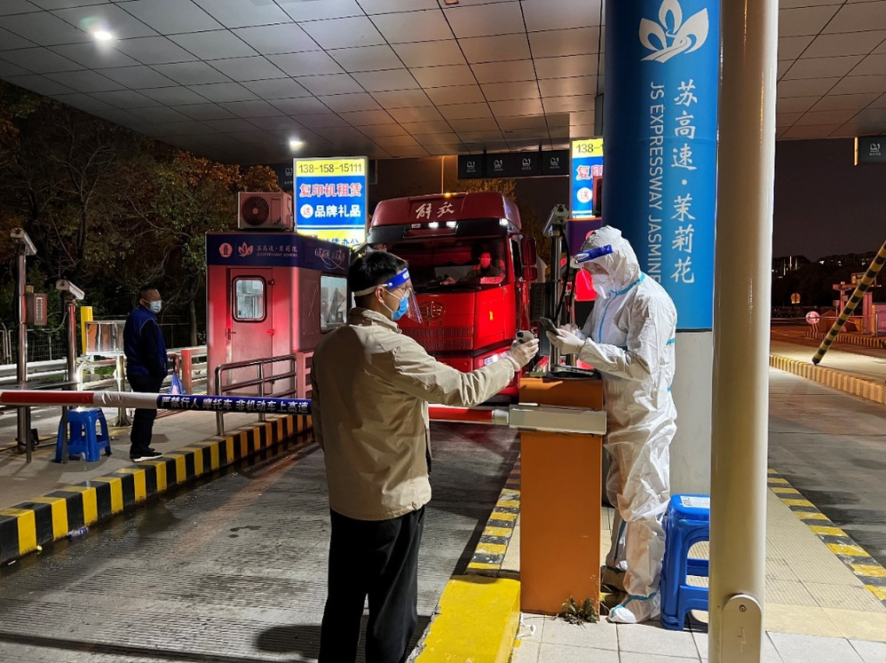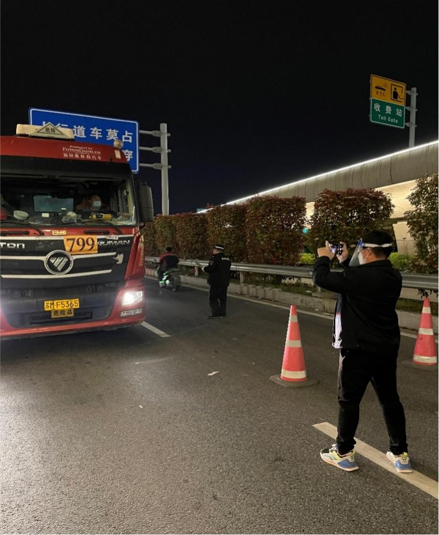 (生產(chǎn)運(yùn)行處董石語(yǔ),在湯汪高速口接駁藥劑運(yùn)輸車輛,向查驗(yàn)點(diǎn)工作人員出示電子通行證)