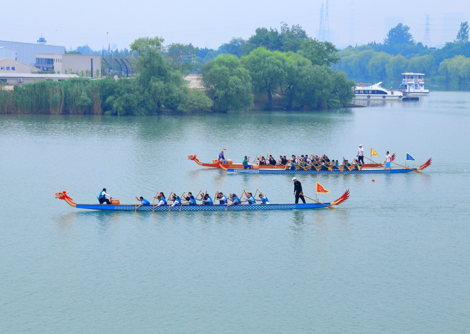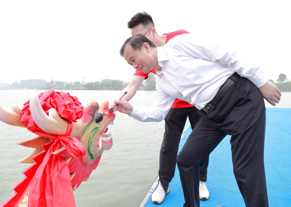 龍舟賽活動現(xiàn)場,葉善祥為每艘賽船龍頭進行了點睛后,宣布龍舟賽正式開賽。哨聲響、鼓點起,3支龍舟隊在水面同時競發(fā),選手們各司其職,精神抖擻,整齊劃一的揮動手中的船槳破浪前行。親友團在岸邊搖旗吶喊、歡呼鼓掌,湖面浪花飛濺,十分壯觀。經(jīng)過訓(xùn)練賽、250米競速賽,最終三只龍舟都齊心協(xié)力抵達終點,角逐出了一二三名,集團領(lǐng)導(dǎo)為獲獎的各支隊伍頒獎。