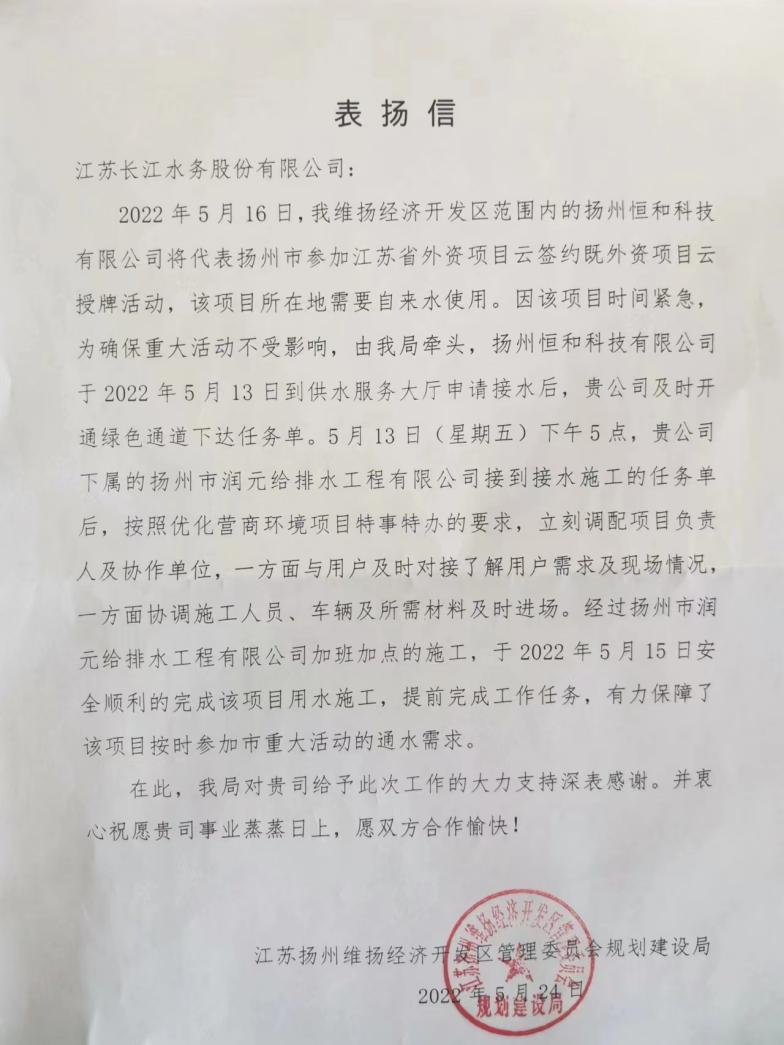 5月30日下午,揚(yáng)州市維揚(yáng)經(jīng)濟(jì)開(kāi)發(fā)區(qū)住建局代表向長(zhǎng)江水務(wù)公司送來(lái)一封感謝信,高度贊揚(yáng)長(zhǎng)江水務(wù)潤(rùn)元公司以大局為重,擔(dān)當(dāng)在先,優(yōu)化營(yíng)商環(huán)境,快速優(yōu)質(zhì)提供供水施工服務(wù)。