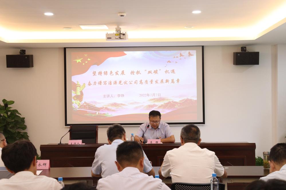 李錚以《堅(jiān)持綠色發(fā)展、搶抓“雙碳”機(jī)遇,奮力譜寫潔源光伏公司高質(zhì)量發(fā)展新篇章》為題,從“把綠色發(fā)展的底色鋪好,必須深刻領(lǐng)會(huì)抓內(nèi)涵”“把綠色發(fā)展的底色鋪好,必須共謀共建強(qiáng)理念”“把綠色發(fā)展的底色鋪好,必須履職盡責(zé)抓落實(shí)”三個(gè)方面闡述了綠色發(fā)展的重要意義,分析了“雙碳”目標(biāo)背景下新能源產(chǎn)業(yè)的發(fā)展機(jī)遇,并對(duì)潔源光伏公司下一步工作提出了具體要求。