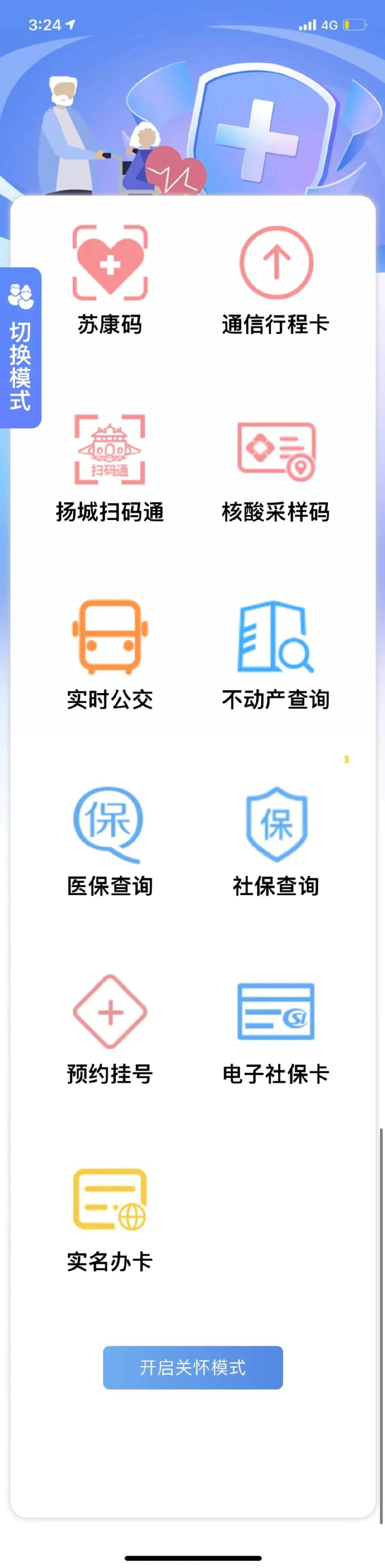 老年人通過手機使用“我的揚州APP”,切換到關(guān)懷模式首頁頁面,不但可以轉(zhuǎn)換成大字體、大圖標的模式,而且首頁頁面集成了經(jīng)常使用的蘇康碼、核酸采樣碼、醫(yī)保查詢、預(yù)約掛號等11項高頻應(yīng)用。7月19日上午,云上揚州推進工作領(lǐng)導(dǎo)小組辦公室、揚州市民卡有限責(zé)任公司舉行新聞發(fā)布會,介紹“我的揚州APP”關(guān)懷模式情況。