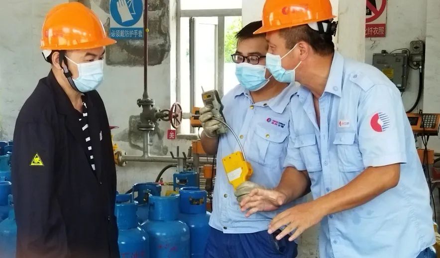 場站外,吳俊榮詳細(xì)詢問了液化氣場站的生產(chǎn)運(yùn)行情況。接著,他戴上安全帽、換上防靜電工作服后,進(jìn)入場站,對(duì)相關(guān)生產(chǎn)區(qū)域做了進(jìn)一步了解。吳俊榮一行來到充裝臺(tái),對(duì)液化氣灌裝作業(yè)進(jìn)行了仔細(xì)觀摩。液化氣灌裝班組嚴(yán)格遵守灌裝制度,先觀察鋼瓶外觀,掃碼做充前檢查,然后“一瓶一碼、一掃一充”,用自動(dòng)灌裝秤進(jìn)行灌裝,再用可燃?xì)怏w報(bào)警儀檢漏,檢查無漏氣后,進(jìn)行充后檢查的作業(yè)制度進(jìn)行。灌裝人員分工明確,忙而不亂,灌裝流程井然有序。