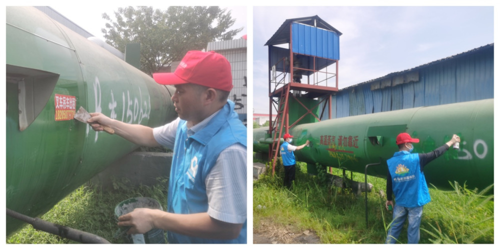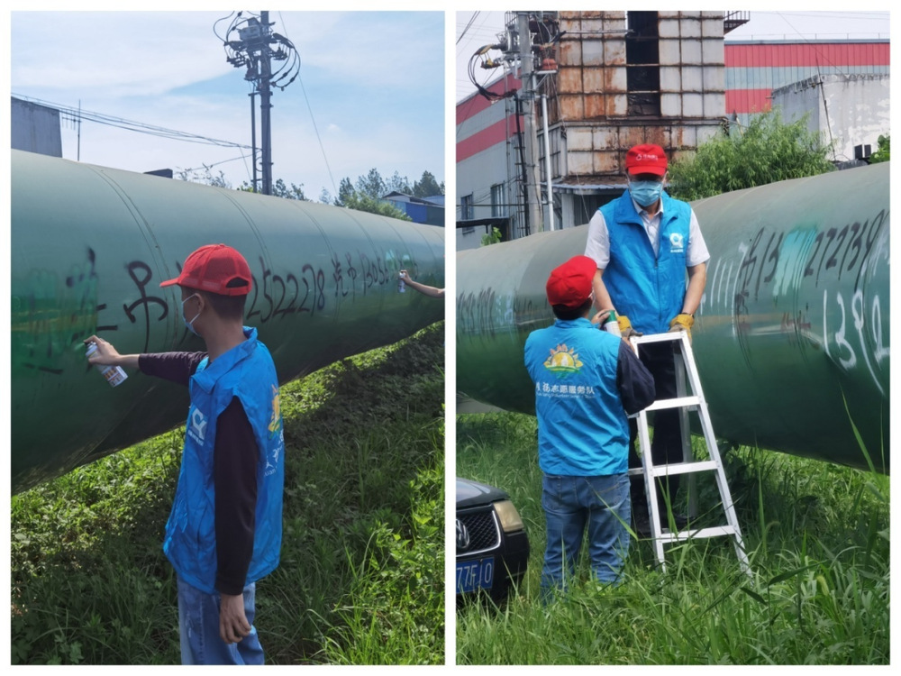 此次活動共22名志愿者參加,集中整治古渡路南段揚(yáng)二線DN800大口徑管道上的“亂貼亂涂”現(xiàn)象。伴隨著烈日驕陽,大家熱情高漲,活動現(xiàn)場呈現(xiàn)一片熱火朝天、干勁十足的景象。一組志愿者在亂貼亂畫的地方,把廣告貼紙噴濕后,再拿清理專用鏟仔仔細(xì)細(xì)地清理,大家配合默契,“洗、遞、擦”一氣呵成。另一組志愿者對管道上噴涂廣告進(jìn)行覆蓋清除,站在架扶梯上,聞著刺鼻的油漆味,對管道外殼上的噴涂廣告進(jìn)行再噴涂覆蓋,他們額頭、臉上、嘴邊布滿細(xì)密的汗珠。