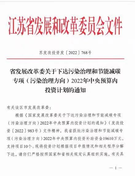 近日,中法環(huán)境收到江蘇省發(fā)展和改革委員會下發(fā)的《關(guān)于轉(zhuǎn)發(fā)下達(dá)污染治理和節(jié)能減碳專項(污染治理方向)2022年中央預(yù)算內(nèi)投資計劃的通知》(發(fā)改投資【2022】983號),中法環(huán)境污泥處置及資源化利用二期項目獲得中央預(yù)算內(nèi)投資補助資金2000萬元(占投資總額16%)。