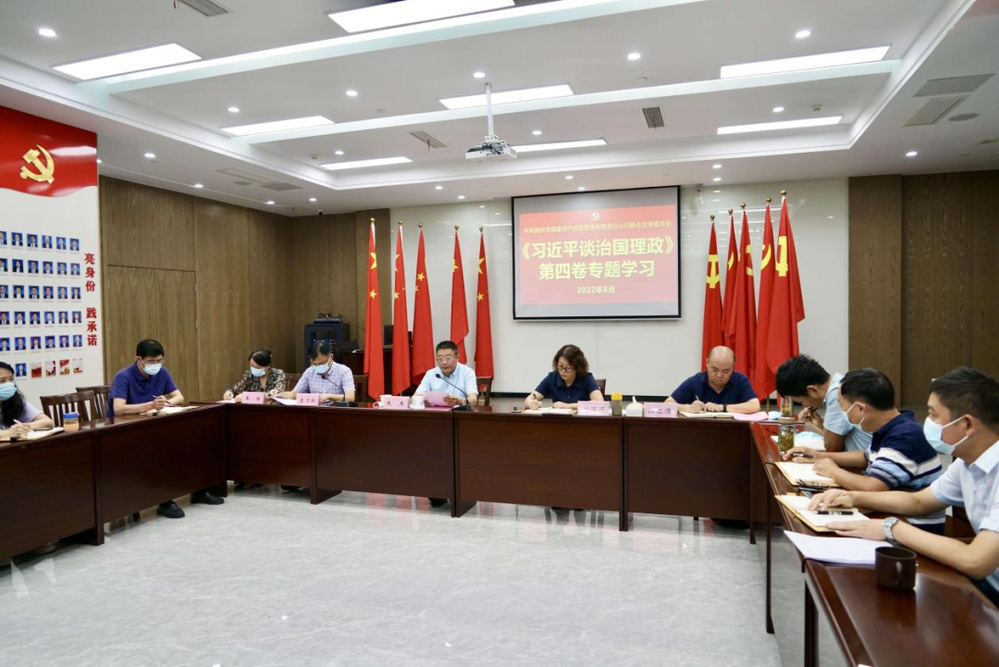為進一步學懂弄通做實習近平新時代中國特色社會主義思想,推動黨的創(chuàng)新理論在全公司上下落地見效,8月31日,資產公司聯(lián)合黨支部召開支委班子理論學習組(擴大)學習會議,專題學習《習近平談治國理政》第四卷。公司聯(lián)合黨支部支委班子成員參加學習會議,并結合各自分管工作和學習情況作主題交流發(fā)言。黨小組組長和各部門、物業(yè)公司負責人列席學習會議。