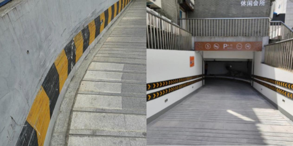 由于停車場原始設(shè)計原因,出入口坡道比較狹窄,轉(zhuǎn)彎部位的墻面經(jīng)常會與往來車輛發(fā)生“親密接觸”,此次改造,在出入口兩側(cè)離坡道地面 60cm高度的墻面上平行加裝了兩道橡膠防撞反光導(dǎo)向標(biāo)條,對車輛及墻面進(jìn)行防撞保護(hù)。