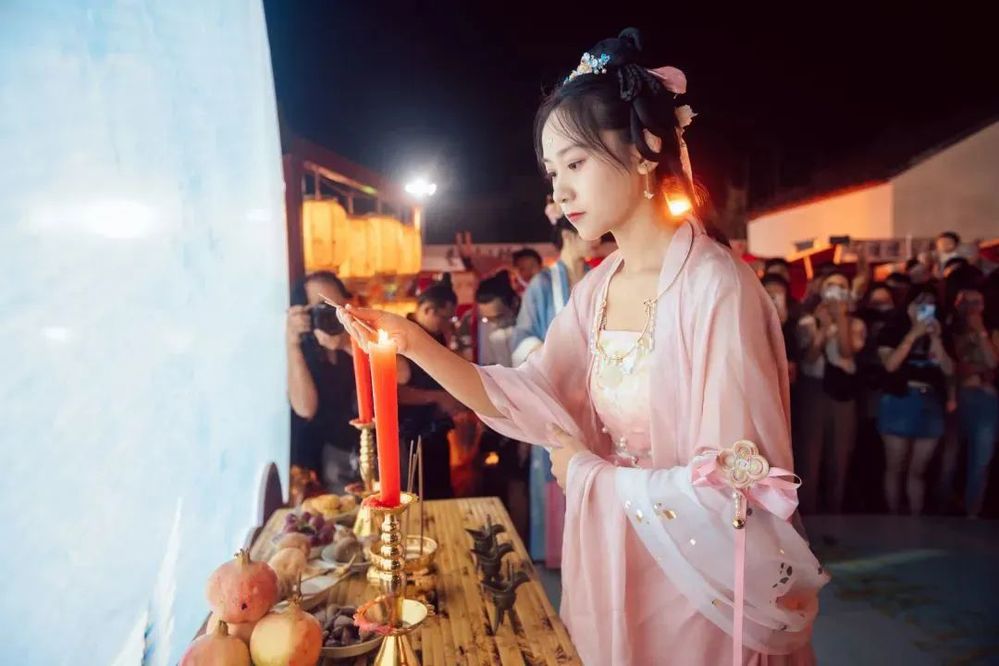 一場莊重的拜月儀式則是將活動推向高潮,設(shè)案于露天,借月光與燭光。數(shù)十位身著漢唐服飾的佳人,神情莊重、步履輕緩。