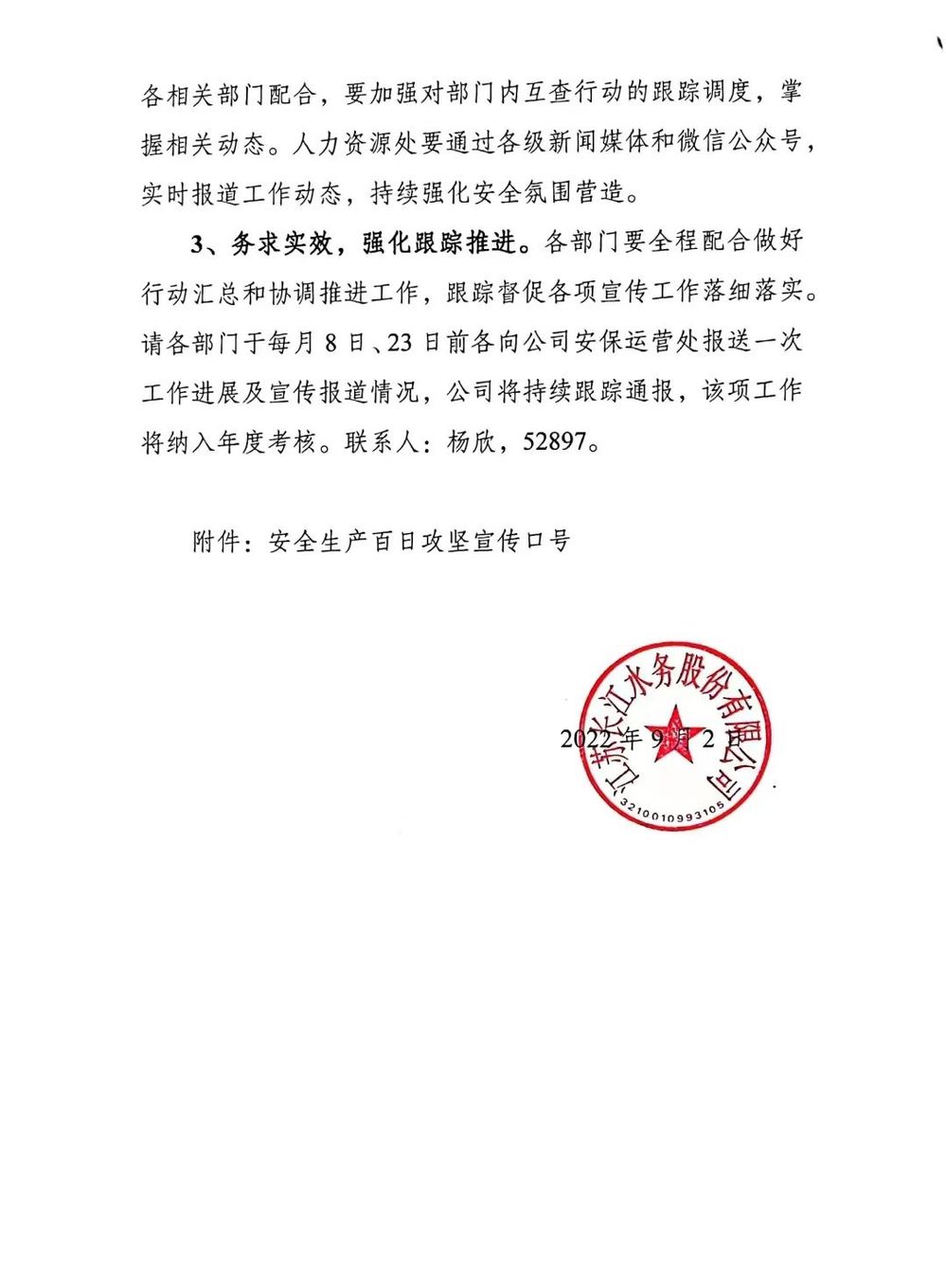 開展安全文化宣傳活動(dòng)。通過安全APP、微信公眾號(hào)等線上平臺(tái)以及設(shè)置宣傳欄、張貼畫報(bào)、電子屏等線下方式,全方位宣傳“安全生產(chǎn)百日攻堅(jiān)”活動(dòng)主題、安全法律法規(guī)以及安全用水常識(shí)等內(nèi)容,加強(qiáng)對(duì)員工的宣傳教育。