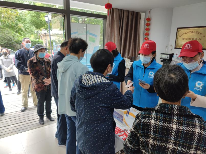 早上9點(diǎn),“e飛揚(yáng)”志愿服務(wù)隊(duì)的志愿者們穿上藍(lán)馬甲,準(zhǔn)備好帶有NFC功能的智能手機(jī)早早地等待在京華城御景園客戶服務(wù)中心?;顒?dòng)還沒開始,聞?dòng)嵍鴣淼睦先藗兙团牌鹆碎L隊(duì),志愿者們一邊分工協(xié)作,一邊維護(hù)現(xiàn)場秩序,溫馨提示大家嚴(yán)格按照疫情防控需求,佩戴好口罩,間隔1米排隊(duì),一邊認(rèn)真負(fù)責(zé)地為老年人辦理審驗(yàn),耐心回答用戶關(guān)于市民卡和“我的揚(yáng)州APP”使用中的問題。
