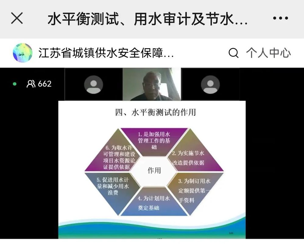 11月2日下午,江蘇省城鎮(zhèn)供水安全保障中心(省水中心)邀請江蘇省工程咨詢中心技術(shù)顧問、蘇州節(jié)能管理進修學院副院長姚芳龍,作“水平衡測試、用水審計及節(jié)水技術(shù)”直播報告。長江水務(wù)公司有關(guān)部門收看直播講座,進行在線學習。