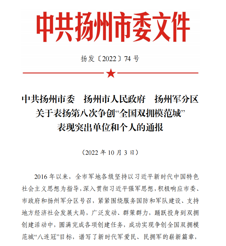 近年來,城控集團(tuán)認(rèn)真貫徹落實(shí)黨中央、國務(wù)院、中央軍委和習(xí)近平總書記對(duì)于新時(shí)代雙擁工作、加強(qiáng)軍政軍民團(tuán)結(jié)的重要指示精神,始終圍繞創(chuàng)建全國雙擁模范城目標(biāo),不斷增強(qiáng)做好雙擁創(chuàng)建工作的思想自覺和行動(dòng)自覺,從加強(qiáng)組織領(lǐng)導(dǎo)、政策落實(shí)和宣傳教育三個(gè)方面入手,積極開展軍民共建活動(dòng),不斷拓展雙擁領(lǐng)域,創(chuàng)新雙擁載體,奮力推動(dòng)揚(yáng)州市雙擁工作邁上新臺(tái)階。