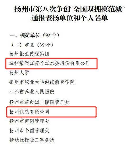 近日,揚(yáng)州市市委、市政府、軍分區(qū)印發(fā)《關(guān)于表揚(yáng)第八次爭(zhēng)創(chuàng)“全國雙擁模范城”表現(xiàn)突出單位和個(gè)人的通報(bào)》,城控集團(tuán)所屬江蘇長江水務(wù)股份有限公司、揚(yáng)州供熱有限公司兩家單位榮獲爭(zhēng)創(chuàng)“全國雙擁模范城”表現(xiàn)突出單位。
