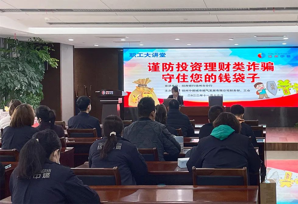 為進一步增強干部員工法治意識和識騙防騙能力,2022年11月16日下午,揚州中燃公司聯(lián)合招商銀行揚州分行開展“謹防投資理財類詐騙”主題普法宣講活動。